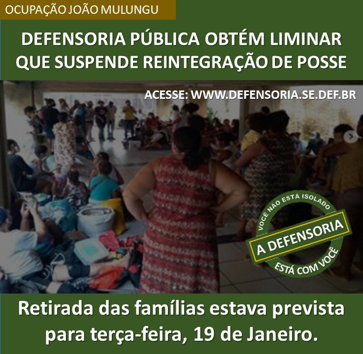 Defensoria Pública obtém liminar que suspende reintegração de posse na Ocupação João Mulungu A Defensoria Pública do Estado de Sergipe, por meio do Núcleo de Bairros, obteve liminar de suspensão de reintegração de posse, que seria cumprida em 19 de janeiro, em favor da Ocupação João Mulungu, em Aracaju. O pedido foi deferido pelo …