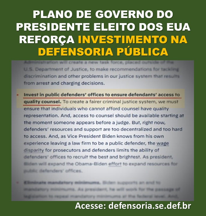 “Assim como no Brasil, a Defensoria Pública é uma instituição essencial na defesa dos menos favorecidos nos Estados Unidos. Esse reconhecimento da importância da Defensoria por parte do presidente eleito Joe Biden demonstra sua sensibilidade com as causas sociais e preocupação com os mais pobres de recursos”, pontuou o defensor público geral em Sergipe, Leó Neto.