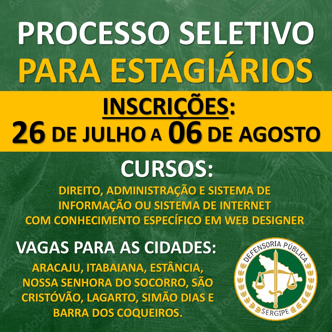 A Defensoria Pública do Estado de Sergipe abriu inscrição para estágio remunerado nos cursos de Direito, Administração e Sistema de Informação ou Sistema de Internet (Com conhecimento em web designer). Os interessados poderão se inscrever, através do site www.defensoria.se.def.br a partir das 12h do dia 26 de julho e às 12h do dia 6 de agosto. A taxa de inscrição é de R$ 20.
