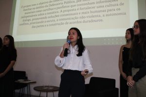 “O professor Nivaldo Moscoso nos apresentou a mediação de conflitos e a história de justiça restaurativa, e isso abriu portas para a criação desse projeto tão importante para a nossa vida acadêmica e para quem vai ser beneficiado com isso, que será a população atendida pelos serviços da Defensoria Pública. Mesmo no primeiro período, aprendemos bastante sobre direitos de família e sobre o princípio da escuta ativa e comunicação não violenta, que é de extrema importância para a mediação de conflitos”, diz a aluna Maria Clara Silva Carvalho.