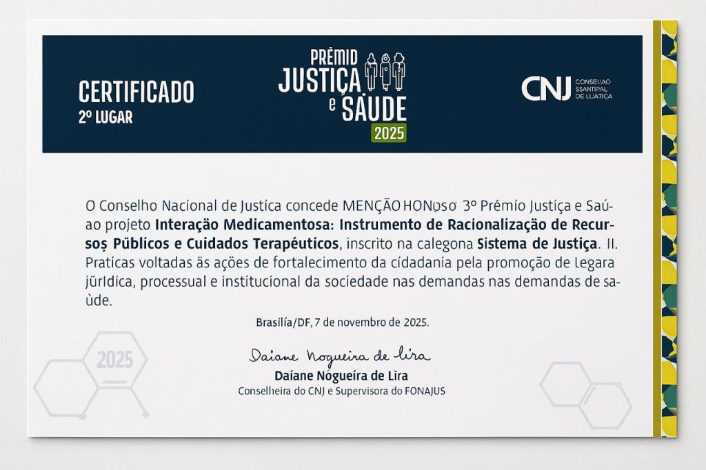 O reconhecimento foi obtido com o projeto “Interação Medicamentosa”, desenvolvido por meio da Câmara de Resolução de Litígios da Saúde (CRLS), que se destacou nacionalmente pelo seu caráter inovador e impacto na segurança dos pacientes.