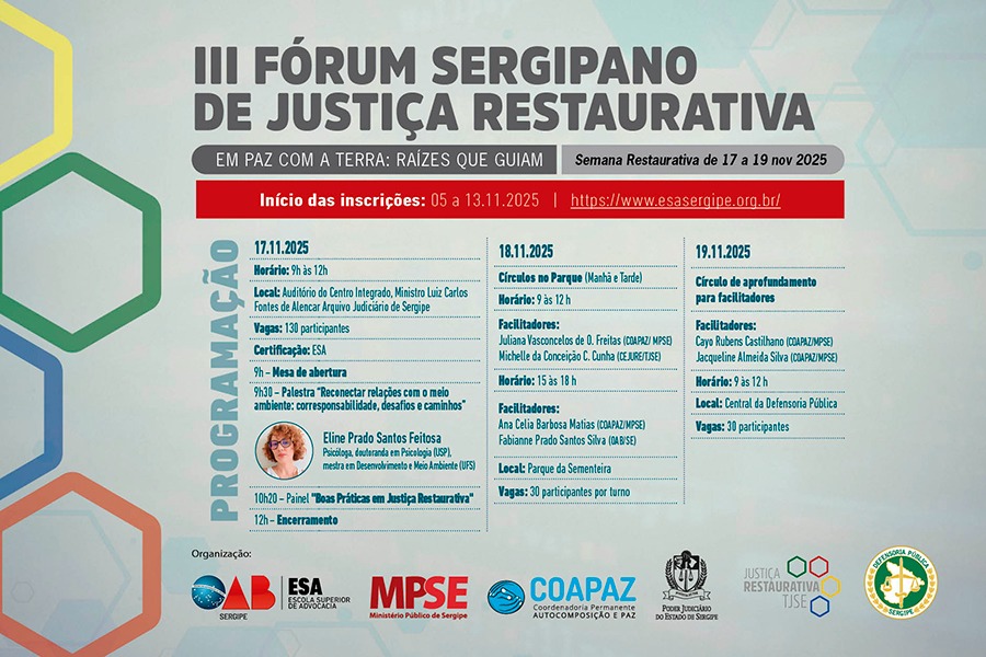 O evento, promovido pelo Tribunal de Justiça de Sergipe (TJSE) por meio do Nupejure, em parceria com a Defensoria Pública, OAB/SE e Ministério Público, tem como tema “Em paz com a Terra: raízes que guiam”, propondo reflexões sobre a conexão entre Justiça Restaurativa, meio ambiente e relações humanas mais conscientes e sustentáveis.