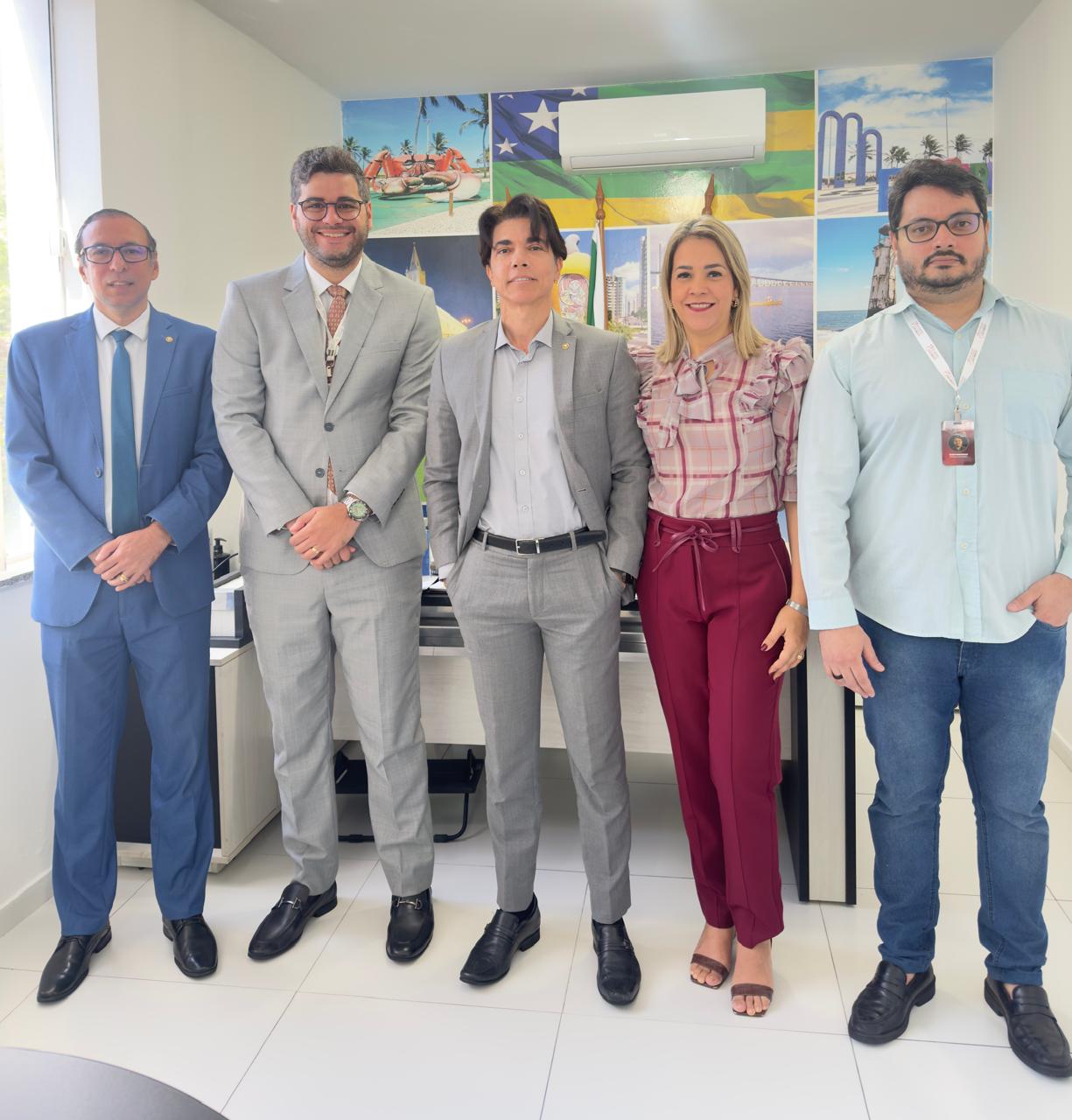 O defensor público-geral, Leó Neto; o subdefensor público-geral institucional, Jesus Jairo Lacerda e a subcorregedora auxiliar, Andreza Tavares receberam o diretor de Graduação da Faculdade de Direito 8 de Julho, Igor Frederico e o coordenador do Núcleo de Práticas Jurídicas, Alberto Hora.